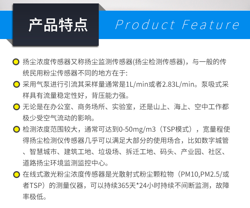 應用 : 揚塵傳感器是一款光散射揚塵傳感器,經過國家計量型式批準認證